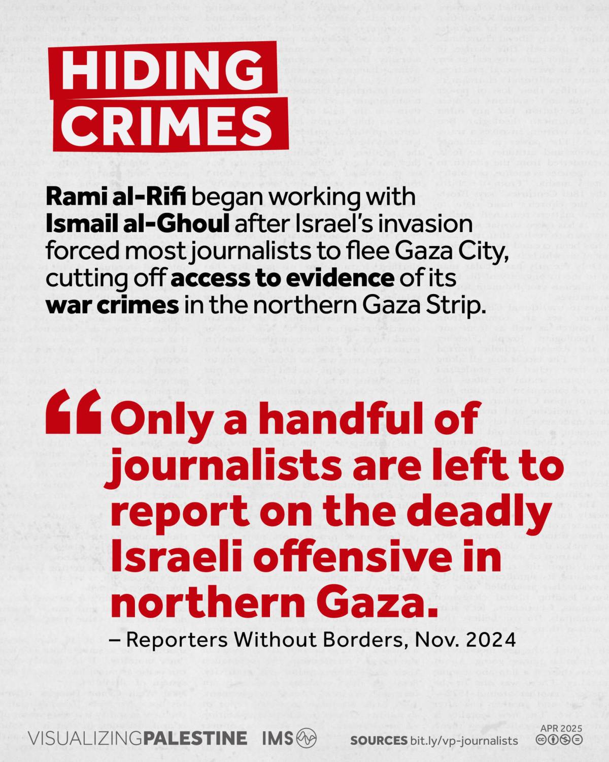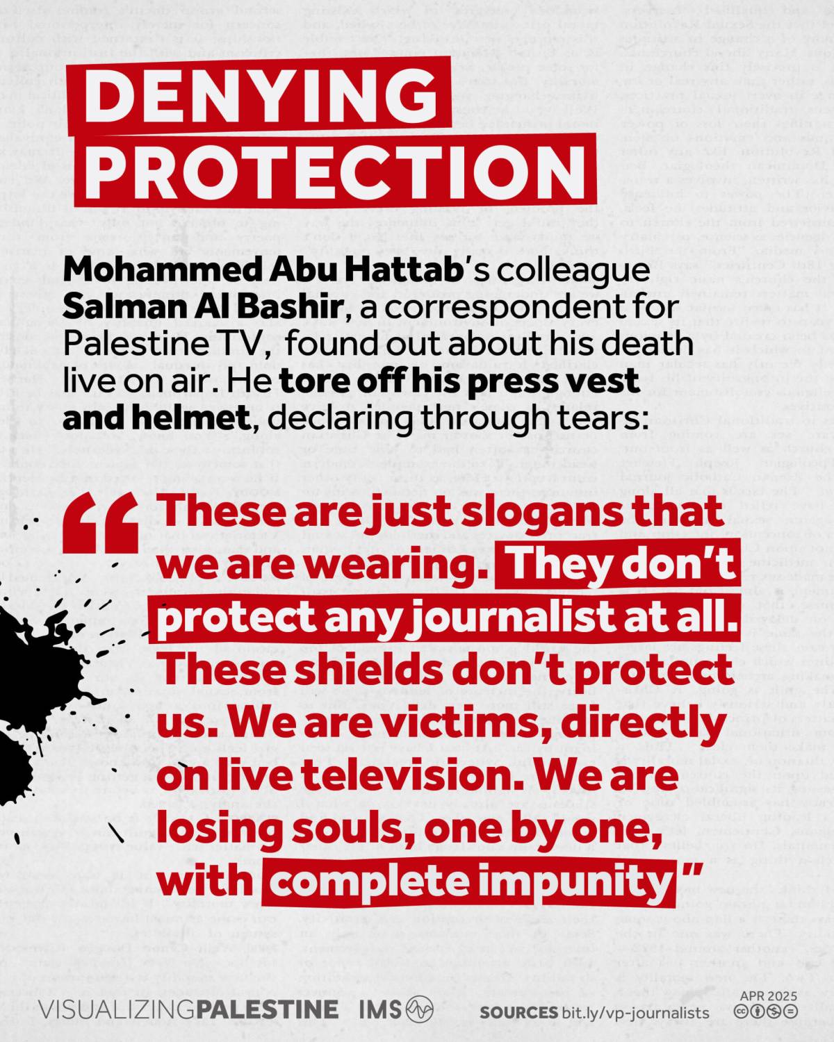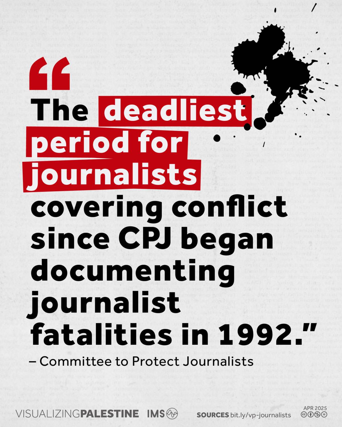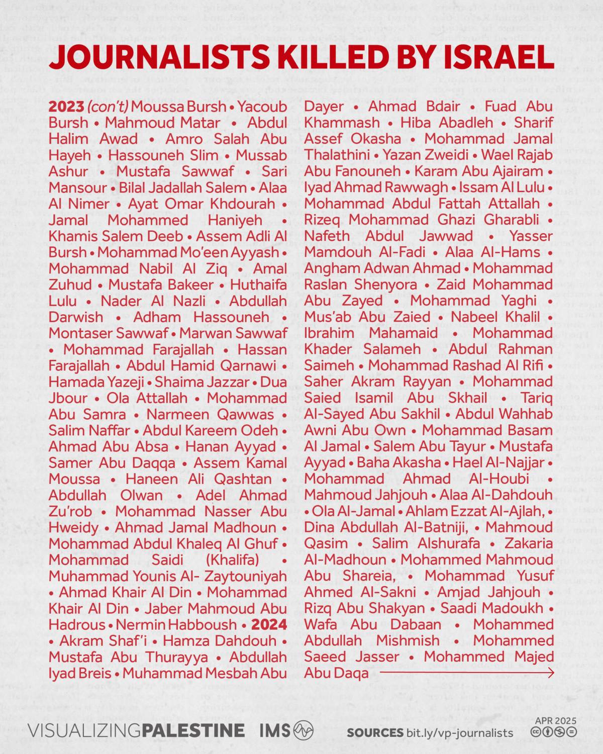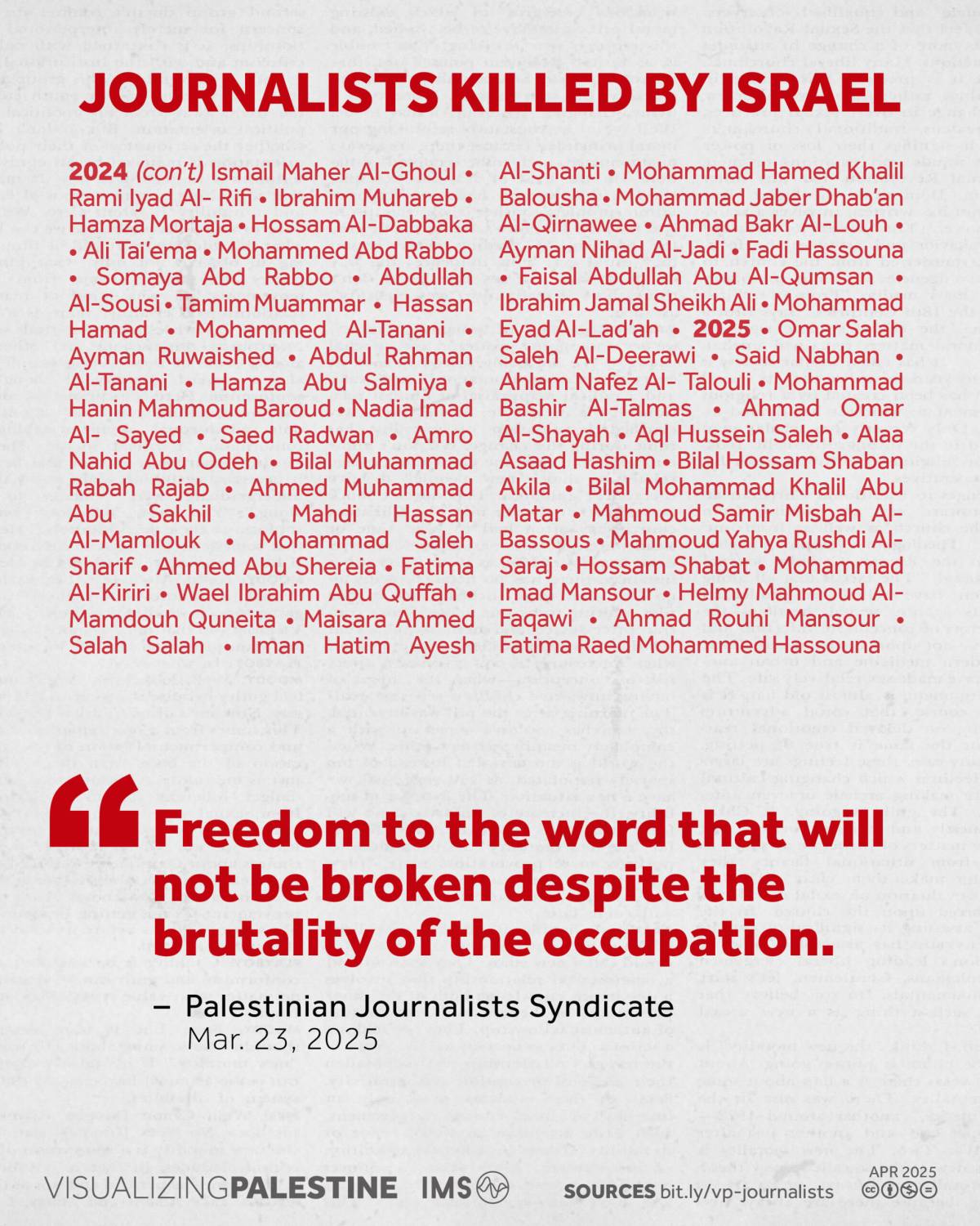 [April, 2025]. In this fourth update of the visual “Killing the Story”, we honor the hundreds of Palestinian journalists killed by Israel. These journalists documented atrocities as they unfolded — voices that the Israeli regime systematically continues to silence.